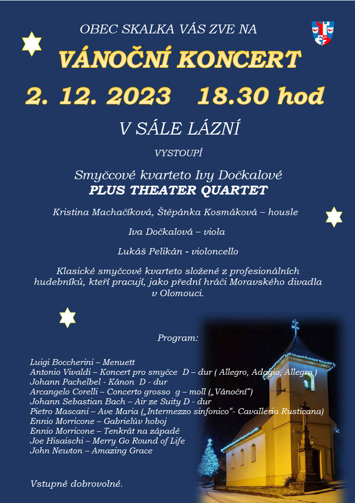 - Srdečně zveme všechny občany na rozsvícení vánočního stromečku, které pořádáme v sobotu 2. prosince od 17:00 hodin. Občerstvení bude zajištěno. Po rozsvícení stromečku Vás zveme na předvánoční koncert, který začíná v 18:30 hod v sále lázní. Vystoupí Smyčcové kvarteto Ivy Dočkalové složené z profesionálních hudebníků z Moravského divadla v Olomouci.