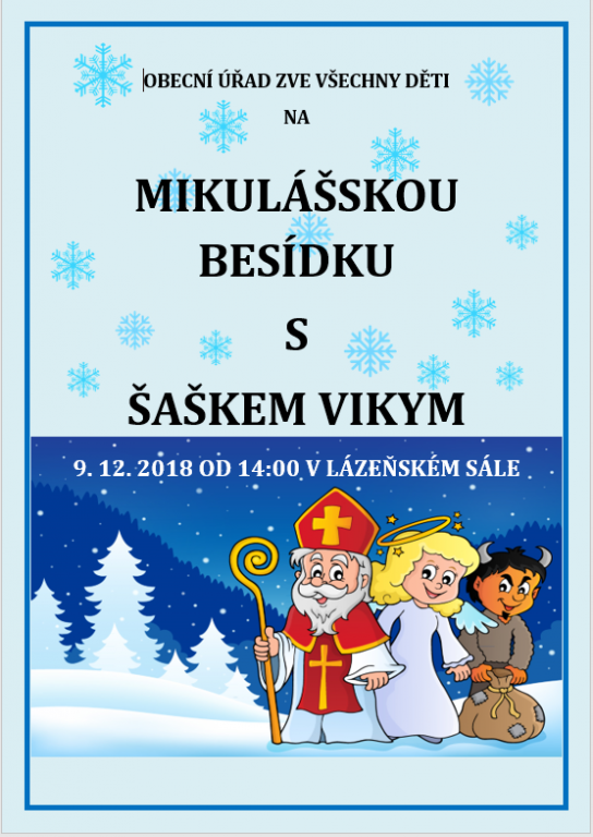Srdečně zveme všechny děti na MIKULÁŠSKOU BESÍDKU S ŠAŠKEM VIKYM, která se koná v neděli 9. prosince 2018 od 14:00 hod v lázeňském sále.