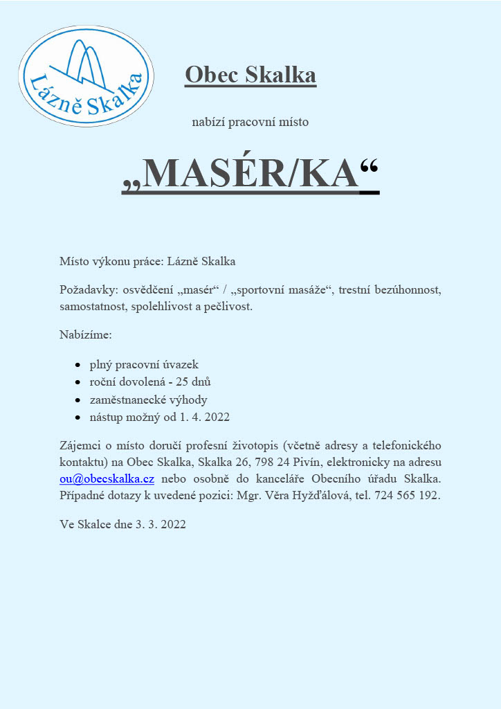 Do pracovního týmu v Lázních Skalka hledáme masérku/maséra.