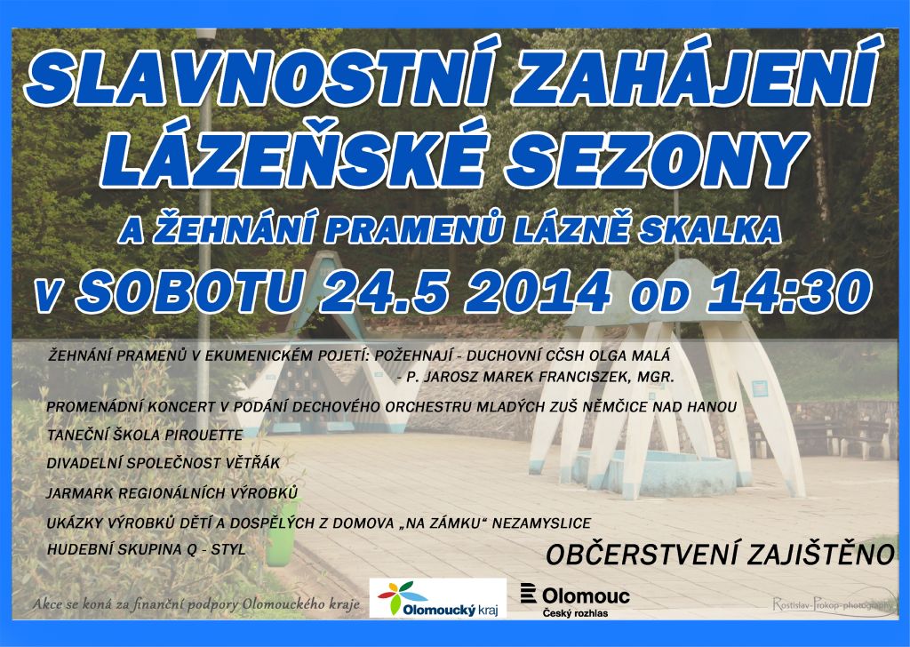 Srdečně Vás zveme na "Slavnostní zahájení lázeňské sezony a žehnání pramenů" v sobotu 24.5.2014 od 14:30 hod. Bohatý kulturní program a občerstvení zajištěno. Viz. plakátek níže