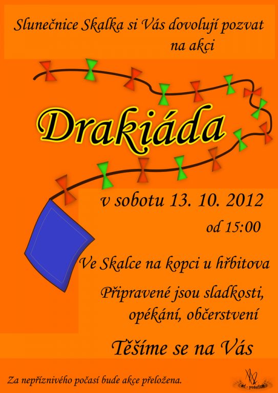 Občanské sdružení Slunečnice Skalka pro Vás připravilo na sobotu 13. října tradiční Drakiádu na kopci u hřbitova. Srdečně jsou zvány všechny děti a jejich rodiče a prarodiče a všichni příznivci pouštění draků. Nebude chybět opékání buřtů, občerstvení a sladkosti. Těsí se pořadatelé.